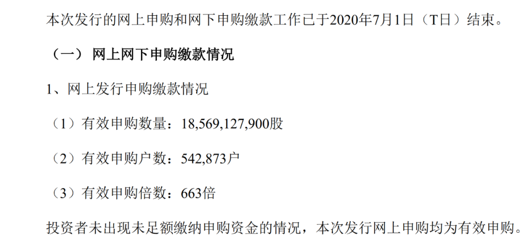 其中,网上发行为有效申购数量18,569,127,900股,有效申购户数为542,873户,有效申购倍数为663倍。以此计算,网上申购冻结资金约1012亿元。根据《发行安排及询价公告》中公布的网上配售原则,网上获配比例为0.19%。