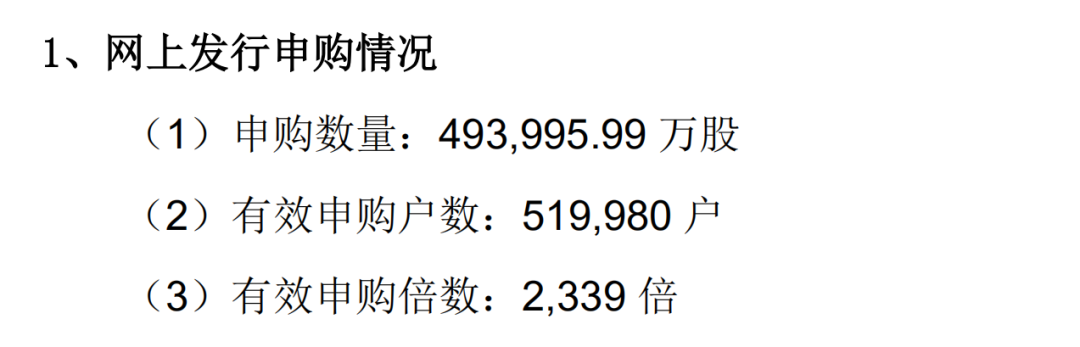 其中,网上发行为有效申购数量493,995.99万股,有效申购户数为519,980 户,有效申购倍数为2,339 倍。以此计算,网上申购冻结资金约1243.88亿元。根据《发行安排及询价公告》中公布的网上配售原则,网上获配比例为0.057%。