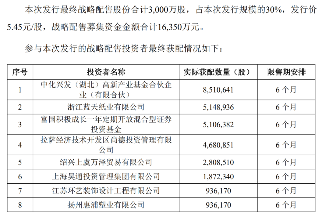 颖泰生物本次发行最终战略配售股份合计3,000万股,占本次发行规模的30%,发行价5.45元/股,战略配售募集资金金额合计16,350万元。